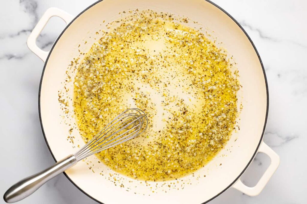 • Once melted and sizzling slightly, add garlic and Italian seasoning along with a couple pinches of salt and pepper. Cook, stirring frequently for 1 minute.
