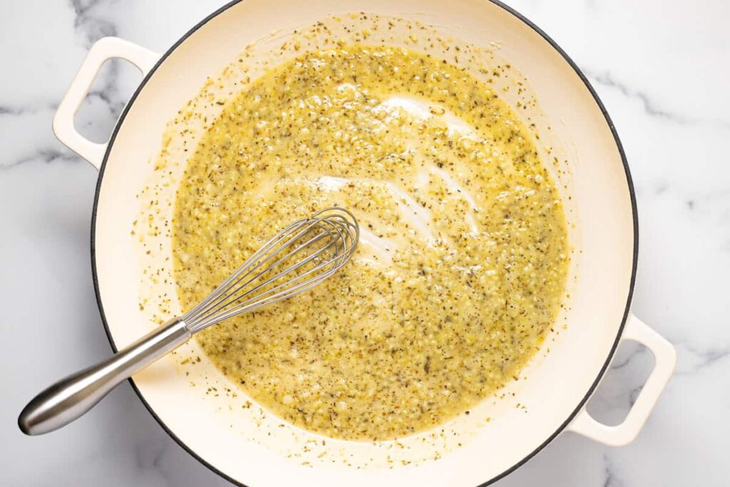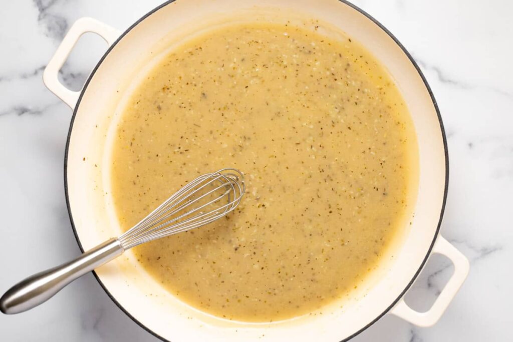 • Turn heat to low and slowly pour in broth, whisking as you pour, until well combined.
