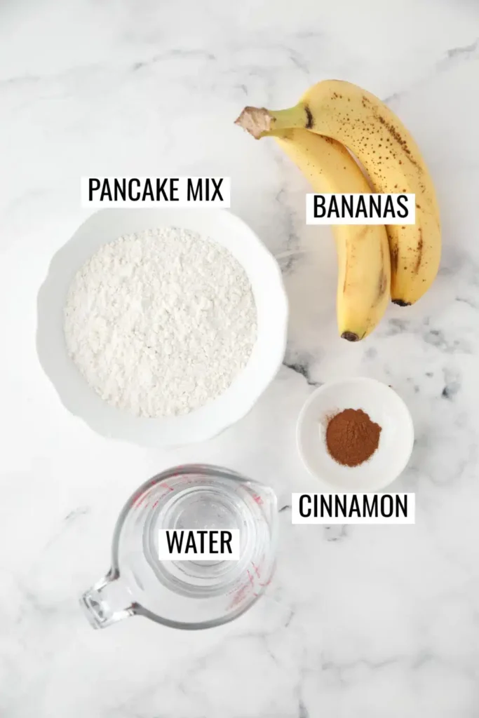 - In a large bowl, mash bananas with a fork. (I weigh them so I don't have to measure them in a cup. If you don't have a kitchen scale, measure them out.) Add the pancake mix, cinnamon, and water. Whisk until combined; some lumps are ok. Set aside.