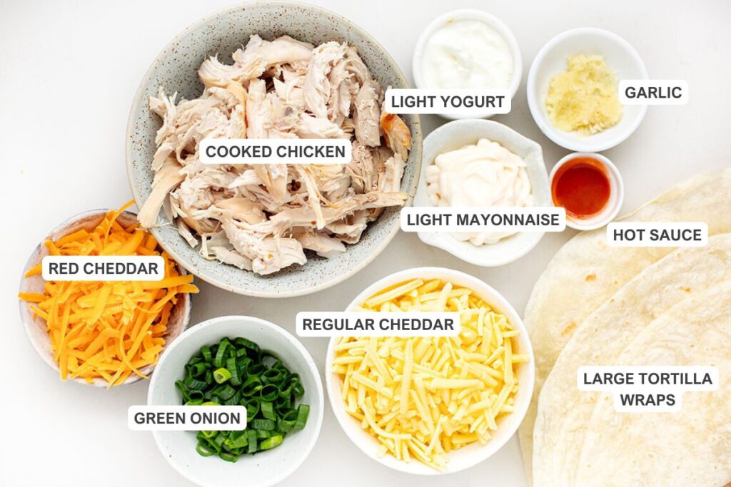 Here is what you’ll need for these cheesy garlic chicken wraps recipe. Find the full measurements in the recipe card below.