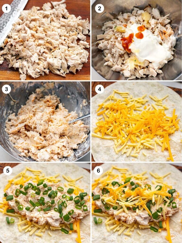 - Fill the wraps: cheese → chicken mix → more cheese → green onion.