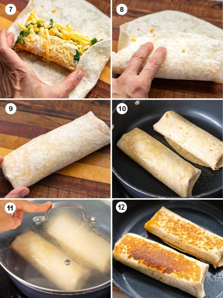 - Place wraps seam-side down. Cook for 3–4 minutes per side until crispy and golden. Cover with a lid to help heat the inside.