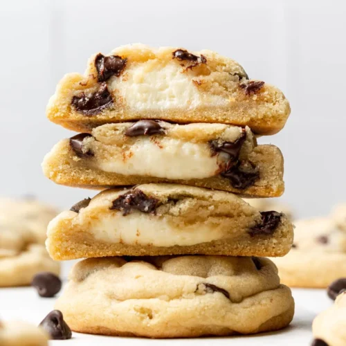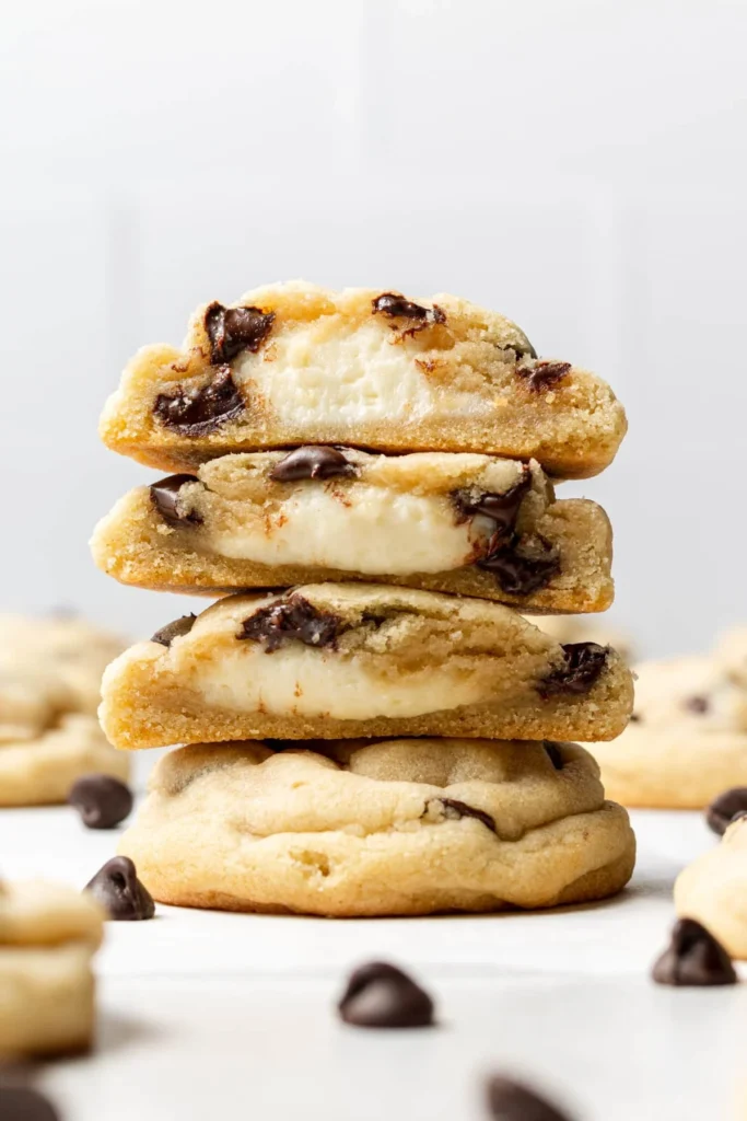 This is such a fun take on a classic chocolate chip cookie! Each chocolate chip cookie is stuffed with cheesecake just before baking, giving you the most delicious cheesecake cookie ever!