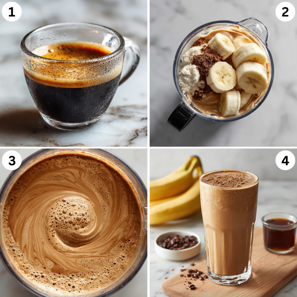 If you’re not using store-bought cold brew, brew a strong cup of coffee and chill it in the fridge for at least an hour. You want the coffee cold so it doesn’t water down the smoothie or melt the banana too quickly.