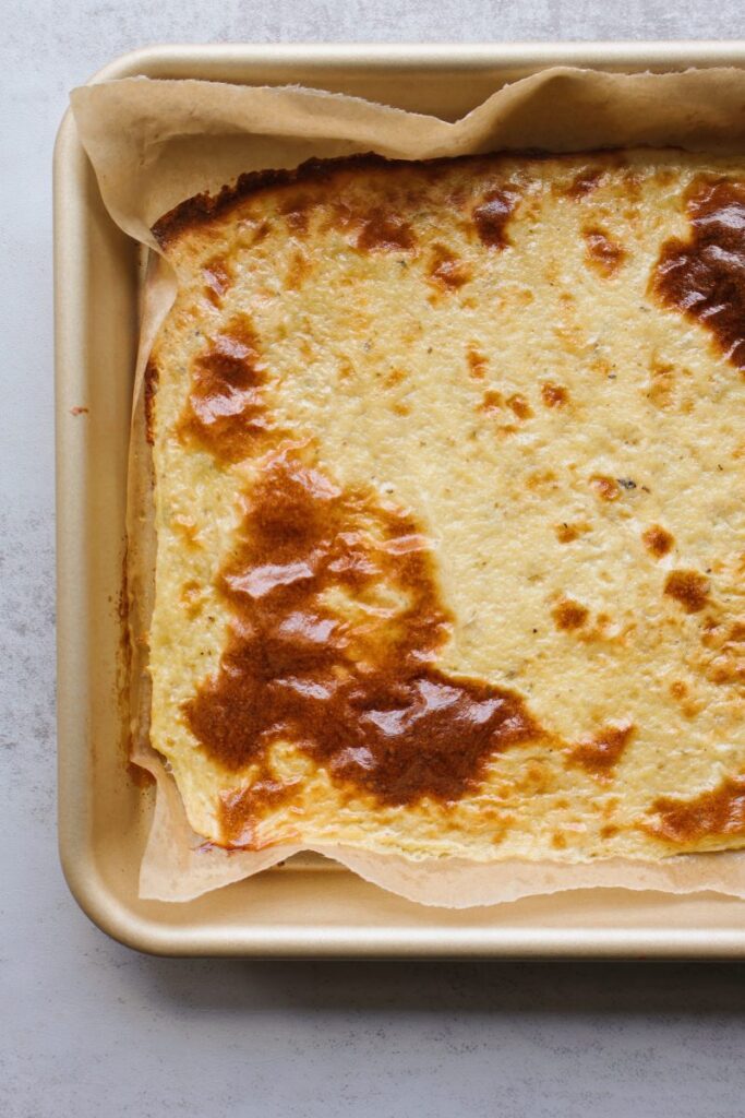 - Bake in the center of the oven for 30–35 minutes, or until the top looks set and lightly golden. Some ovens may take a bit longer.