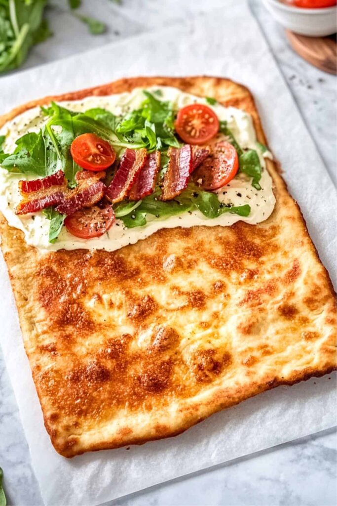 Now comes the fun part! Slice it into sections or keep it whole, then fill with whatever you’re craving. I love it with cream cheese, crispy bacon, and cherry tomatoes—but it’s also great with grilled chicken, veggies, or even scrambled eggs for a breakfast wrap.