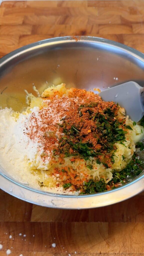 • Transfer potatoes to a large mixing bowl.Mash thoroughly with a potato ricer or fork until smooth.Add cornstarch, seasoning and chopped parsleyStir until a cohesive dough forms.