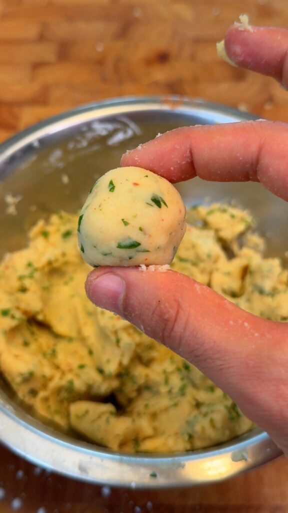 Mash until smooth, then mix in cornstarch, seasonings, and parsley until a cohesive dough forms.