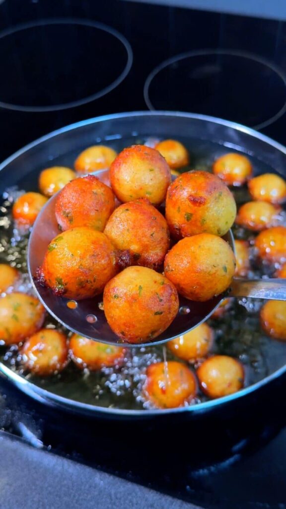 Heat oil in a deep skillet or pot. Carefully fry the potato balls in batches until golden and crispy all around.
