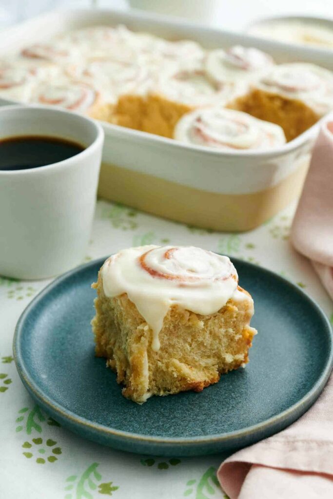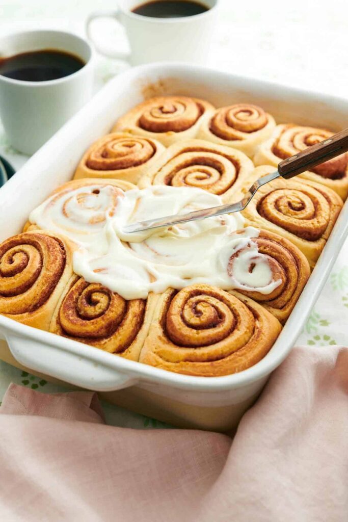 This is the perfect recipe to assemble at night and bake the next morning. To make overnight cinnamon rolls, shape the rolls, cut them, and place them in the prepared baking pan before covering them with plastic wrap and refrigerating for up to 18 hours. Making them ahead like this allows you to skip the second rise, as they will rise in the fridge. When ready to bake the buns, remove the pan from the fridge and let them come to room temperature for an hour. Once at room temperature, uncover the rolls and bake as directed.