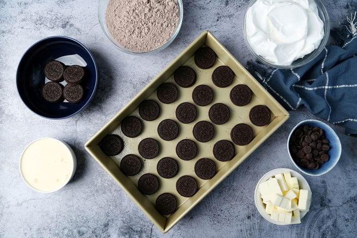 Preheat the oven to 350°F. Spread the Oreo cookies evenly over the bottom of a greased 13×9-inch baking dish.