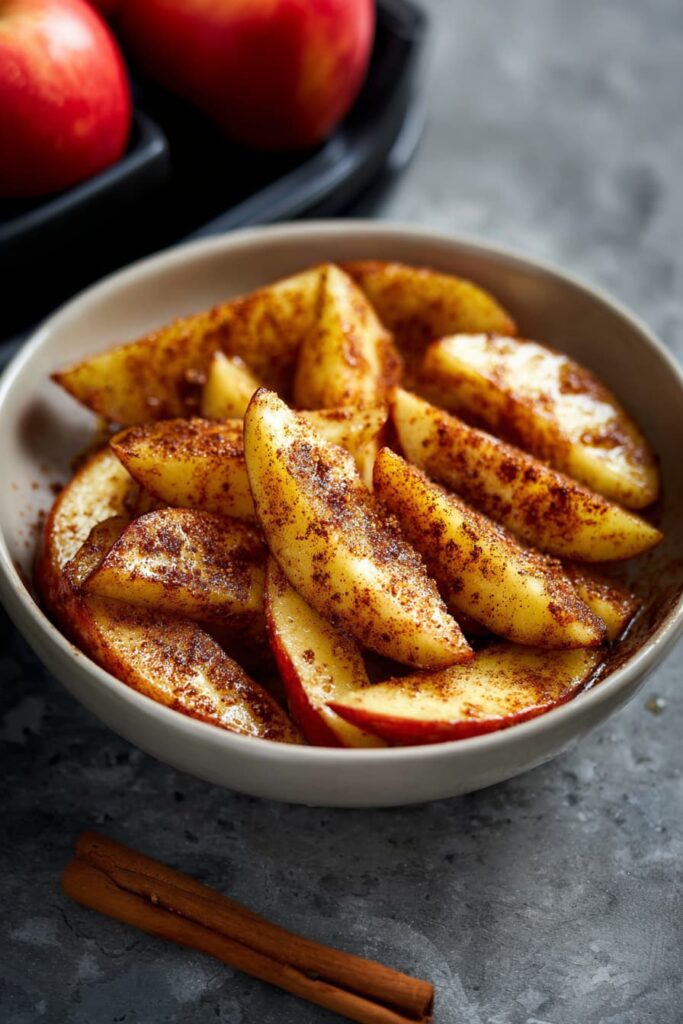 Make sure not to slice the apples too thin, or they’ll go soggy fast. About ¼ inch thick is ideal thick enough to hold up in the air fryer but still soft inside.