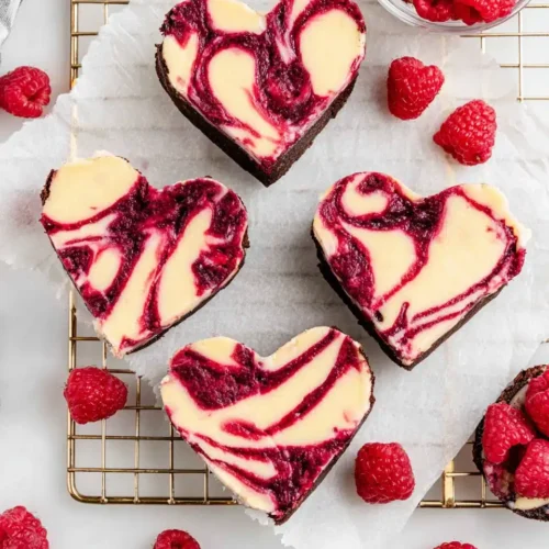 These Valentine’s Day brownies are more than just cute—they’re outrageously good. The fudgy chocolate base melts into a luscious cheesecake layer, while ribbons of raspberry add a burst of tangy sweetness. The combination is perfectly balanced and absolutely irresistible.