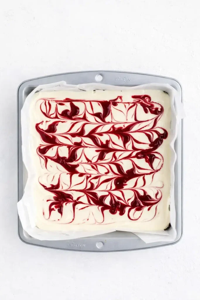 Spread the brownie batter in a parchment-lined 8×8 pan. Pour cheesecake mixture on top. Add spoonfuls of raspberry sauce and gently swirl with a knife or skewer for a marbled pattern.