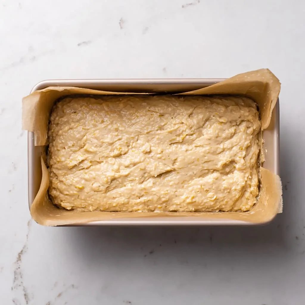 - Pour batter into the prepared loaf pan and smooth the top.
