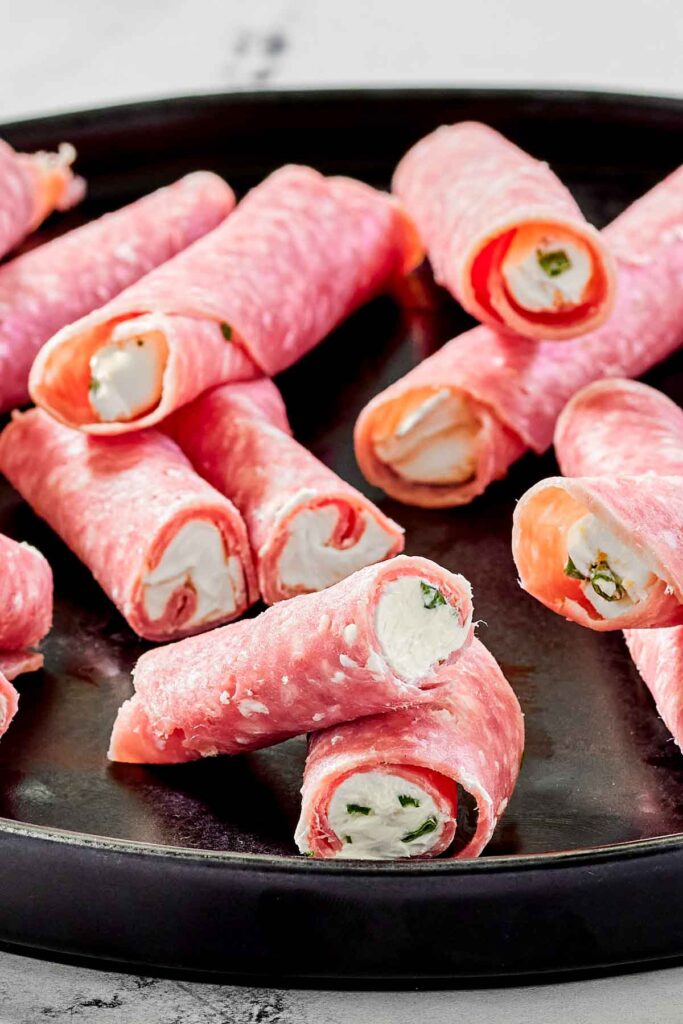 These salami roll-ups were so easy to put together. I had my kids help me and they had a great time! You don’t have to cook anything, and yet the flavors are off the charts. You can find the exact measurements below in the recipe card.