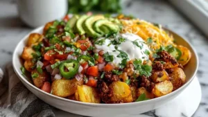 Step 5: Divide the crispy potatoes among 4 serving bowls (about 1 cup potatoes per bowl). Top each bowl with approximately ¾ cup of the meat mixture. Immediately sprinkle 3-4 tablespoons of shredded cheddar over each bowl and let it sit for 30 seconds to melt. Add cherry tomatoes, diced avocado, and fresh cilantro. Serve with lime wedges and a dollop of sour cream.