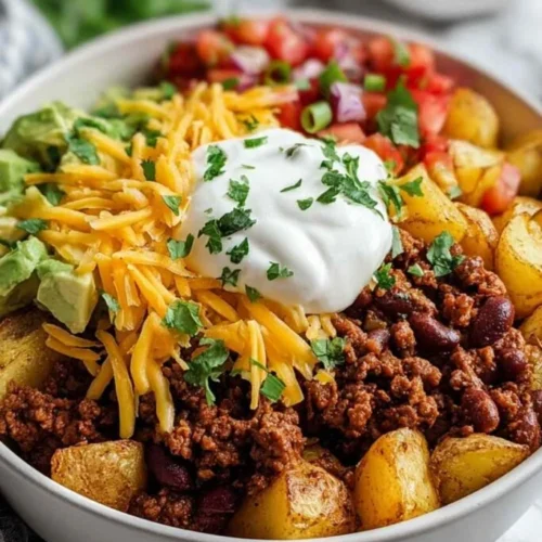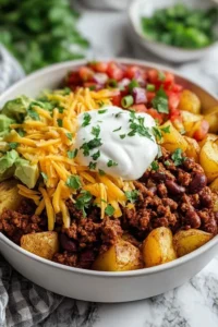 I stumbled onto this recipe on a particularly hectic Sunday afternoon when I had leftover taco-seasoned beef and some russet potatoes begging to be used. My 16-year-old daughter walked into the kitchen, took one look at the crispy golden potatoes topped with seasoned beef and melted cheese, and actually said, “Mom, this looks legitimately good.” Coming from her, that’s basically a Michelin star. The combination of crispy roasted potatoes as the base instead of rice or tortillas completely transforms the typical taco bowl experience. You get that satisfying crunch with every bite, plus each serving delivers 38 grams of protein from the meat, beans, and cheese. My son, who usually picks apart anything remotely healthy, went back for seconds and asked when we’re having it again.