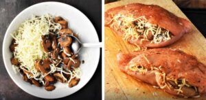 The mushrooms are browned for maximum flavour, then combined with (a moderate amount of) mozzarella cheese, which binds them together and melts as the chicken cooks. The mushroom-stuffed chicken breasts are seared for more colour and flavour, then finish cooking in the oven.