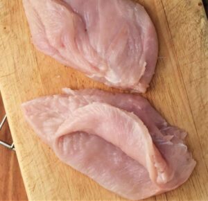 - Tenderise chicken: Place the chicken breasts (cut side up) on top of a cutting board and cover with plastic wrap. Using a rolling pin or the bottom of a frying pan gently pound the thicker part of the meat a few times to tenderise and flatten it a little (be careful not to flatten it too much).