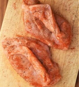 5. Season chicken: Sprinkle each chicken breast all over with salt, pepper, paprika and thyme. Rub the seasoning and herbs into the meat to make sure it’s covered evenly.