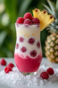 - Frozen Layered Effect: Blend raspberries separately from the coconut-pineapple base and layer for a “sunset swirl” visual.