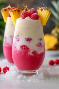 - Optional garnish: fresh raspberry, pineapple wedge, mint sprig, shredded coconut rim