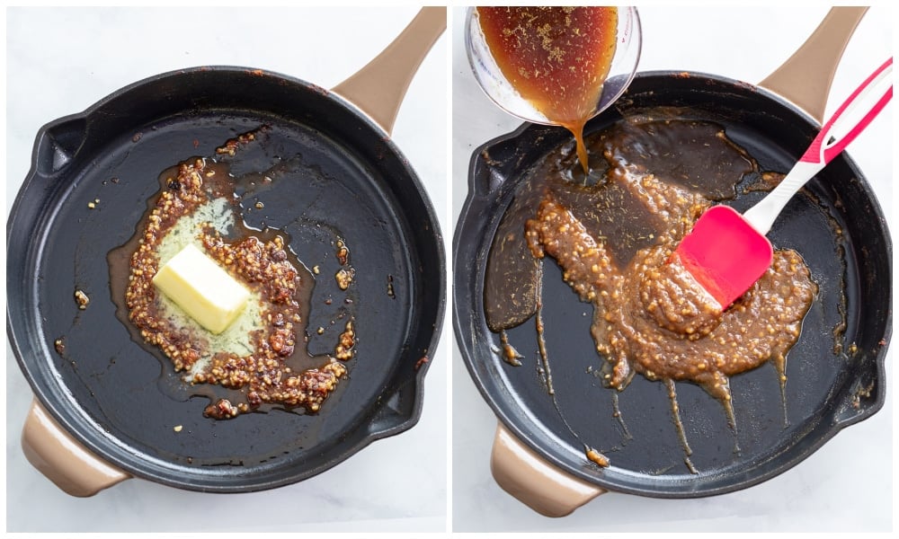 Deglaze the skillet with white wine and reduce by half. Add the butter and the garlic, then stir in the flour for 2 minutes. Add the beef broth/seasoning mixture in small splashes, stirring continuously.