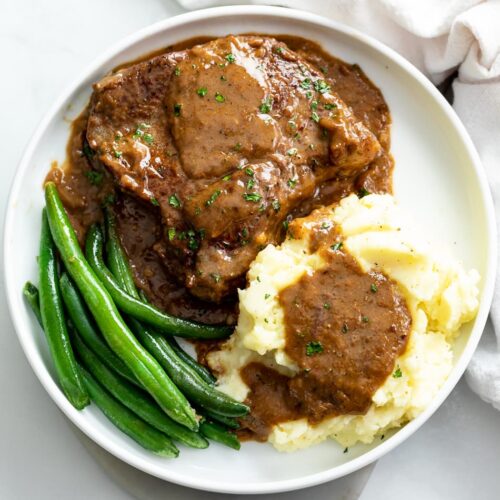 This Steak with Gravy recipe is the definition of cozy comfort! This gravy is so flavorful, and the steak is perfectly cooked to your liking! Serve this with mashed potatoes and roasted green beans for the ultimate family dinner!