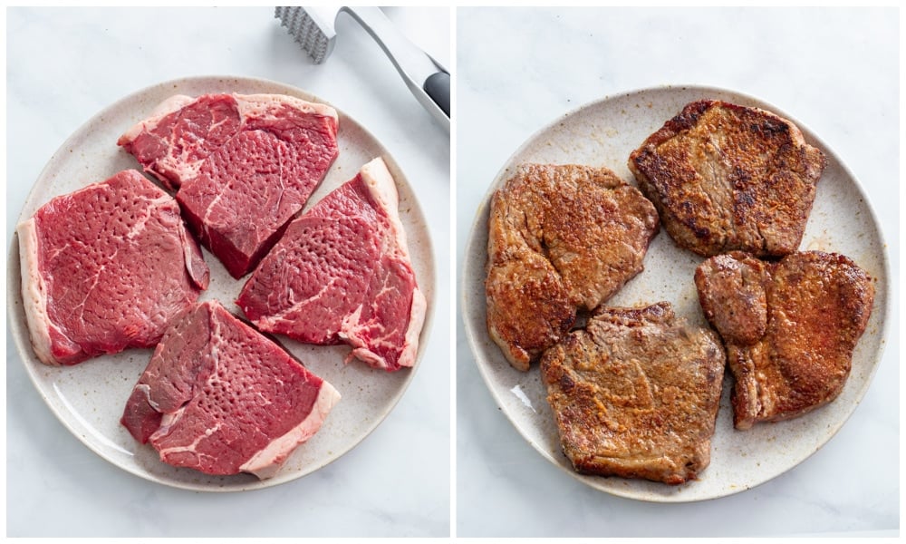 Gently tenderize the steaks and pat them dry. Season each side and sear in a skillet. Set aside.
